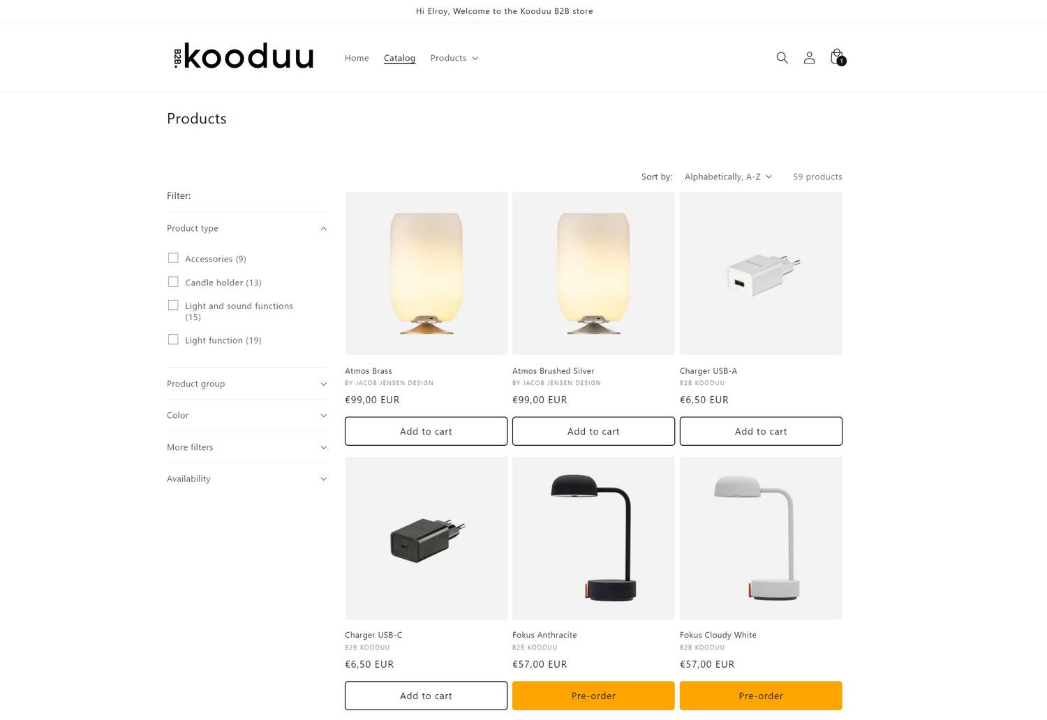 When navigating the B2B website, you will find it easy to locate the products you are searching for. Our user interface is specifically designed for Kooduu resellers who are already familiar with a majority of our products. You can use product type or product groups filters to discover similar items. Additionally, filtering by product color allows you to create orders that match your preferences.